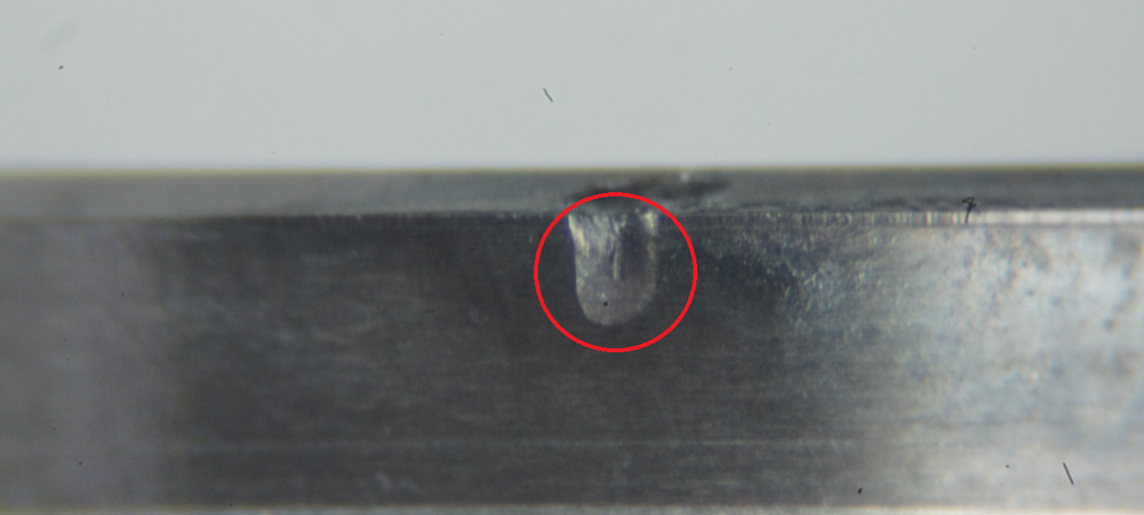 クレーター摩耗はスクイ面側に発生する事が多い摩耗状態です。主に切削速度、送り量の大きさが要因となります。クレーター摩耗状態で加工を続けると刃先がチッピング、溶着し、最終的に欠損します。様々な要因で途中から削れなくなり、削れない状態で同じ切削条件の加工を行うと発生します。